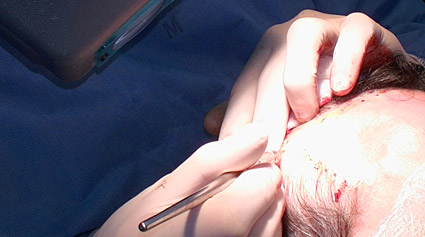 - Extracción de unidades foliculares: esto se lleva a cabo mediante una herramienta denomina punch (sacabocados) de un calibre que oscila entre los 0,75 y los 0,9 milímetros, con la que se rodea la unidad folicular y se realiza un pequeño corte en paralelo al eje del pelo y una profundidad controlada. Hecho esto, el folículo aislado se extrae con unas pinzas muy finas y se clasifica en función del número de pelos que contiene (de uno a cuatro). Mientras dura la extracción de unidades foliculares (hasta 4.000 en cada sesión), éstas se conservan a baja temperatura en una solución especial que permite mantener su vitalidad.